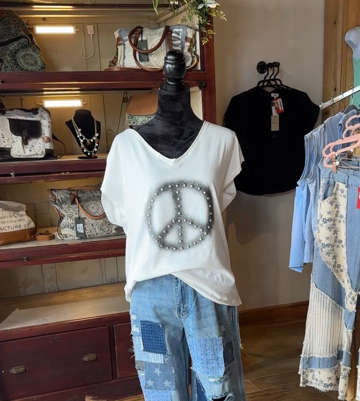 Designed in a V-neckline knit top, short sleeve length with raw edge, stud detailing along the peace print, seam out with raw edge on the center back. featured in cotton jersey.