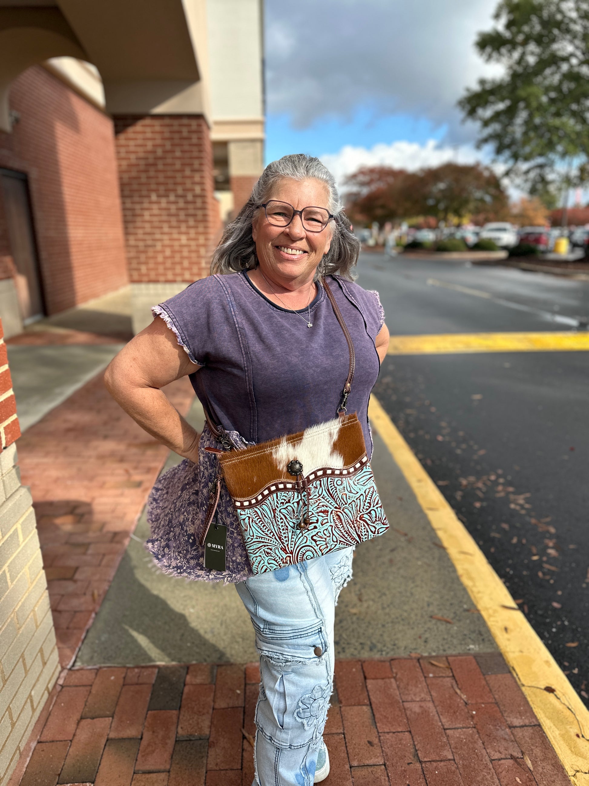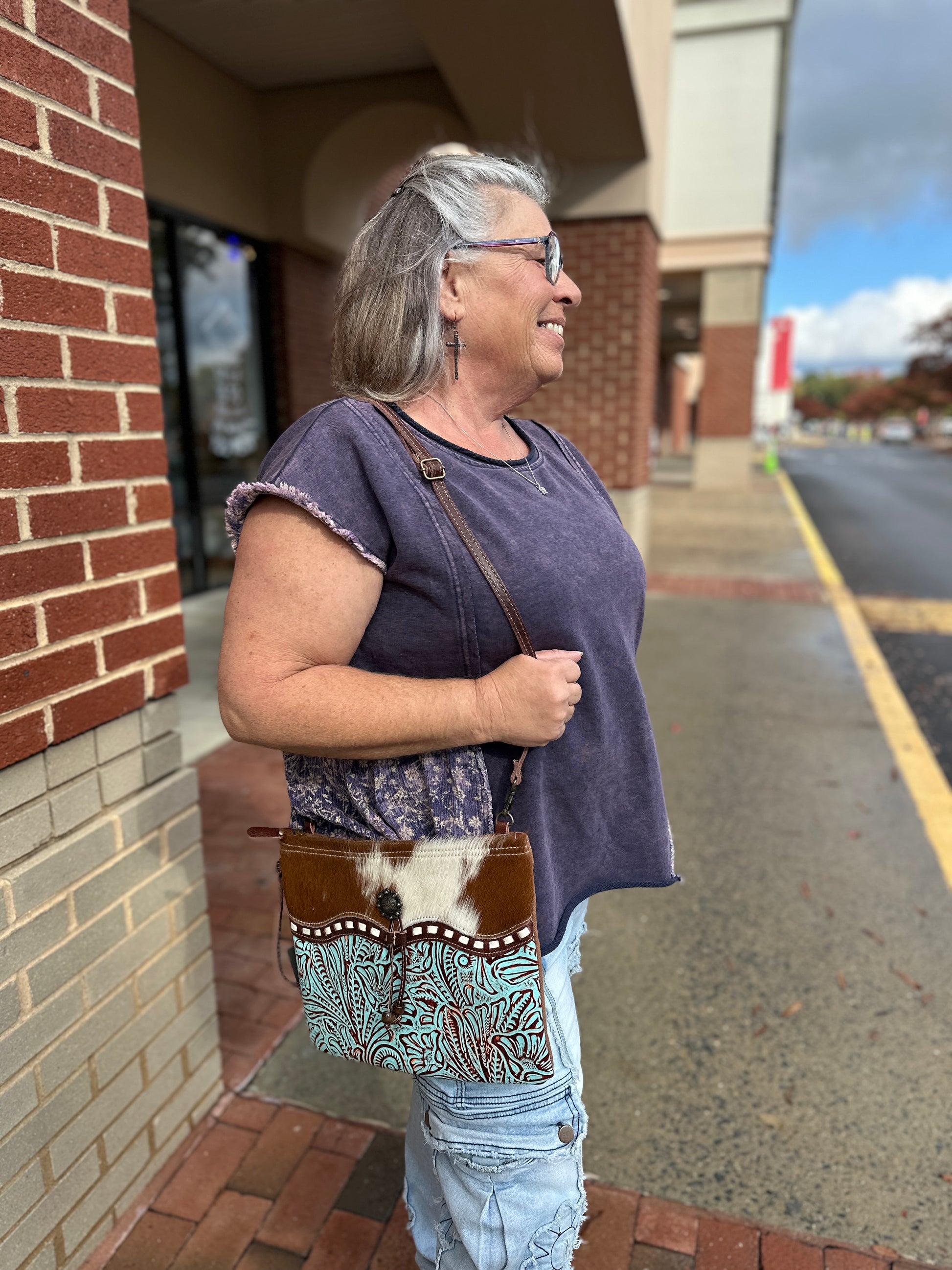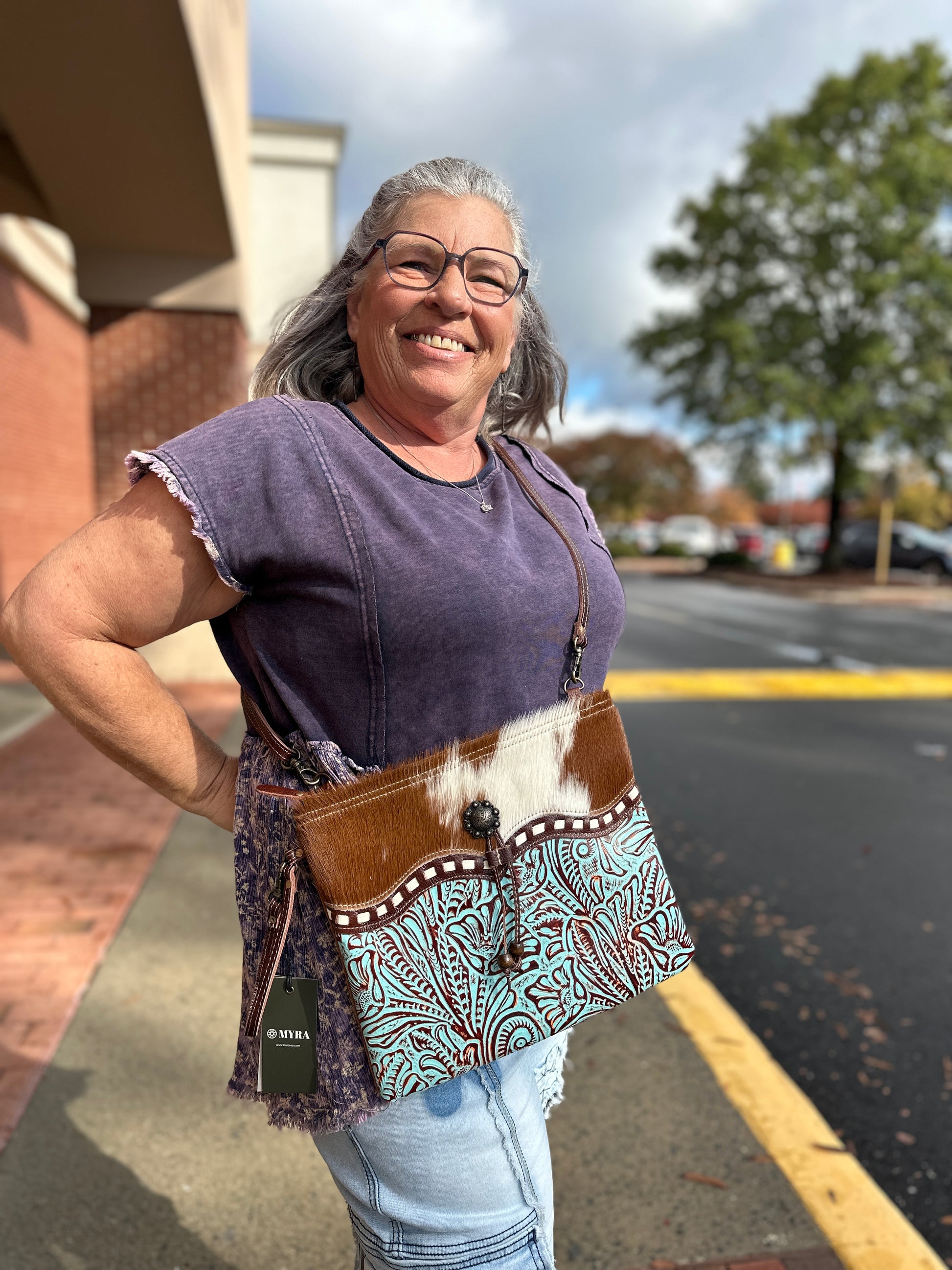 Carry effortless style with this hand tooled crossbody that brings authentic western charm to your everyday look. The striking turquoise leather and intricate tooled details create a one-of-a-kind piece that transforms any outfit from ordinary to extraordinary.