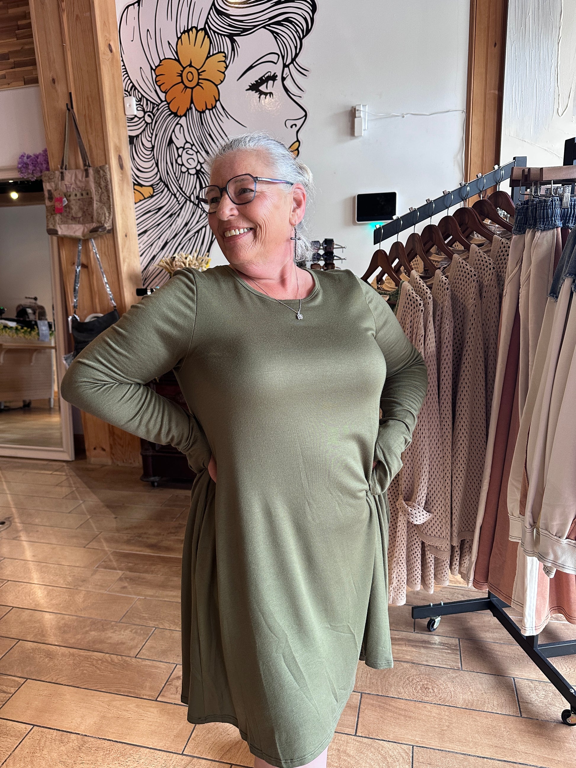 The Jake Long Sleeve Crewneck Dress is not only so cute, but a comfortable, all-in-one outfit perfect for your boho wardrobe! This dress is perfect for lounging at home or taking on the town because it features: * So cozy, lightweight, stretch knit fabric * Relaxed and flattering fit-and-flare silhouette at a mini length * Classic crew neckline * Fitted long sleeves with thumbhole detail. Made in USA