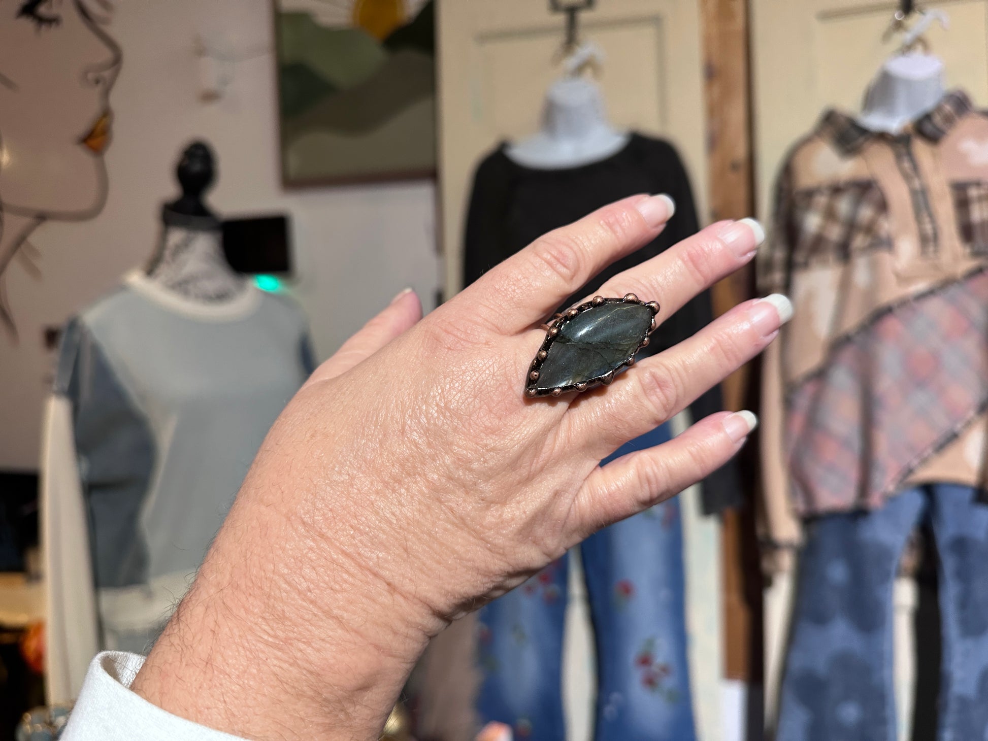 Add a touch of bohemian style to your outfit with our Labradorite Ring Set in Antique Copper! Featuring a unique design, this set is sure to make a statement. The antique copper finish adds a vintage touch, while the soothing blue and green hues of the labradorite stone provide a calming energy. Elevate your look with this one-of-a-kind ring set today!