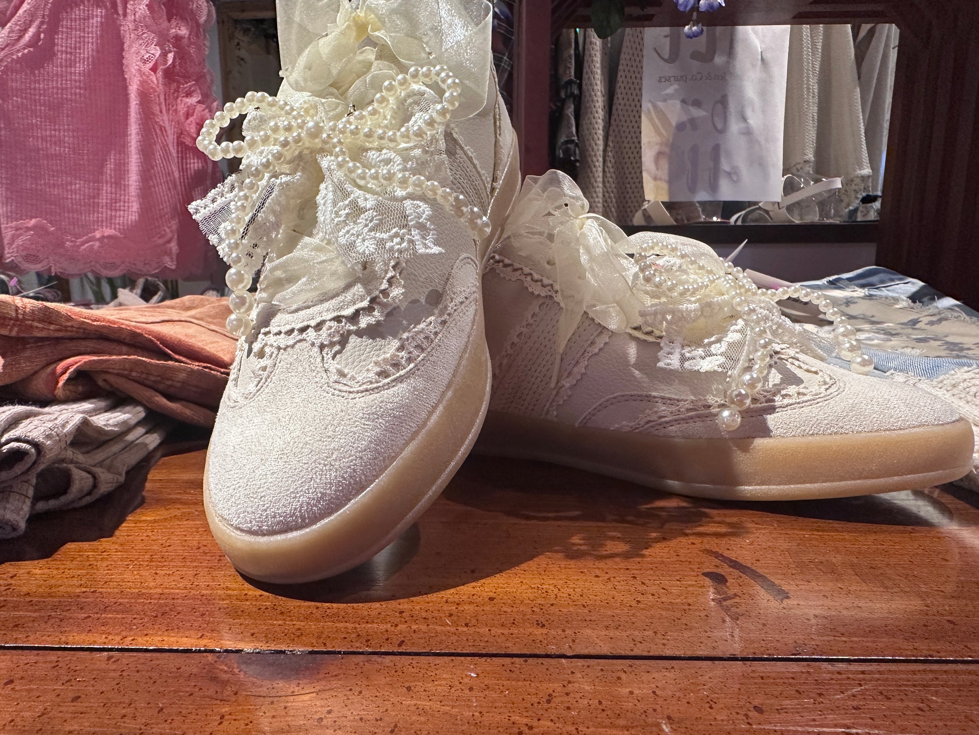 Elevate your style with our Lace and Ruffle Sneakers! These trendy and comfy shoes will add a touch of charm to any outfit with their unique bow charms. Don't wait too long, these beauties won't be around forever!