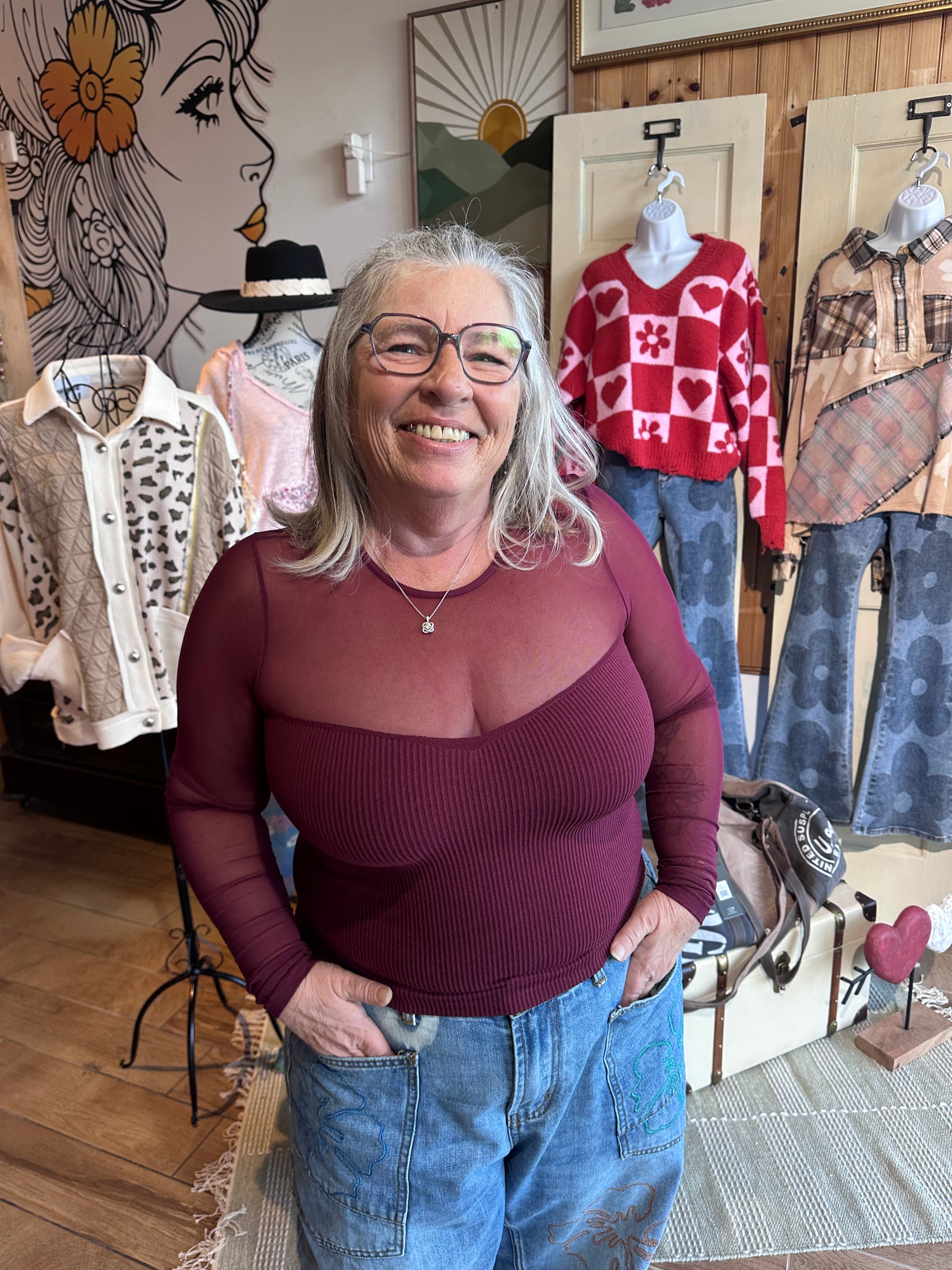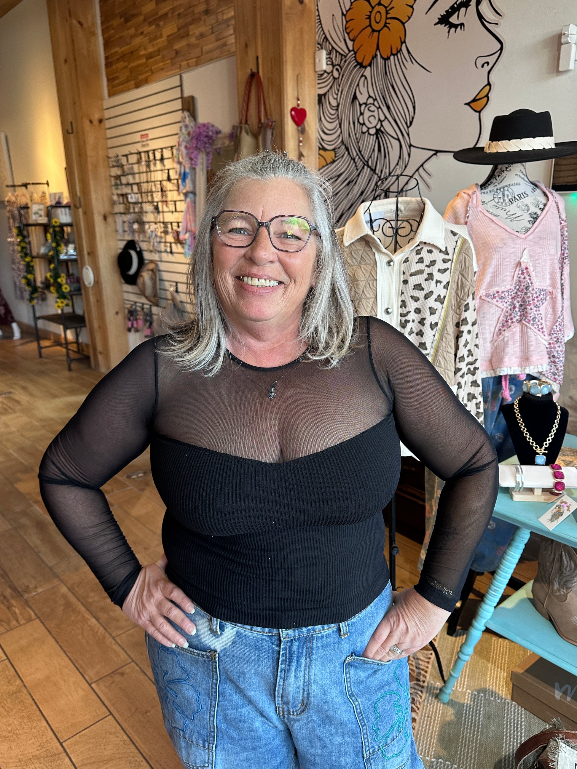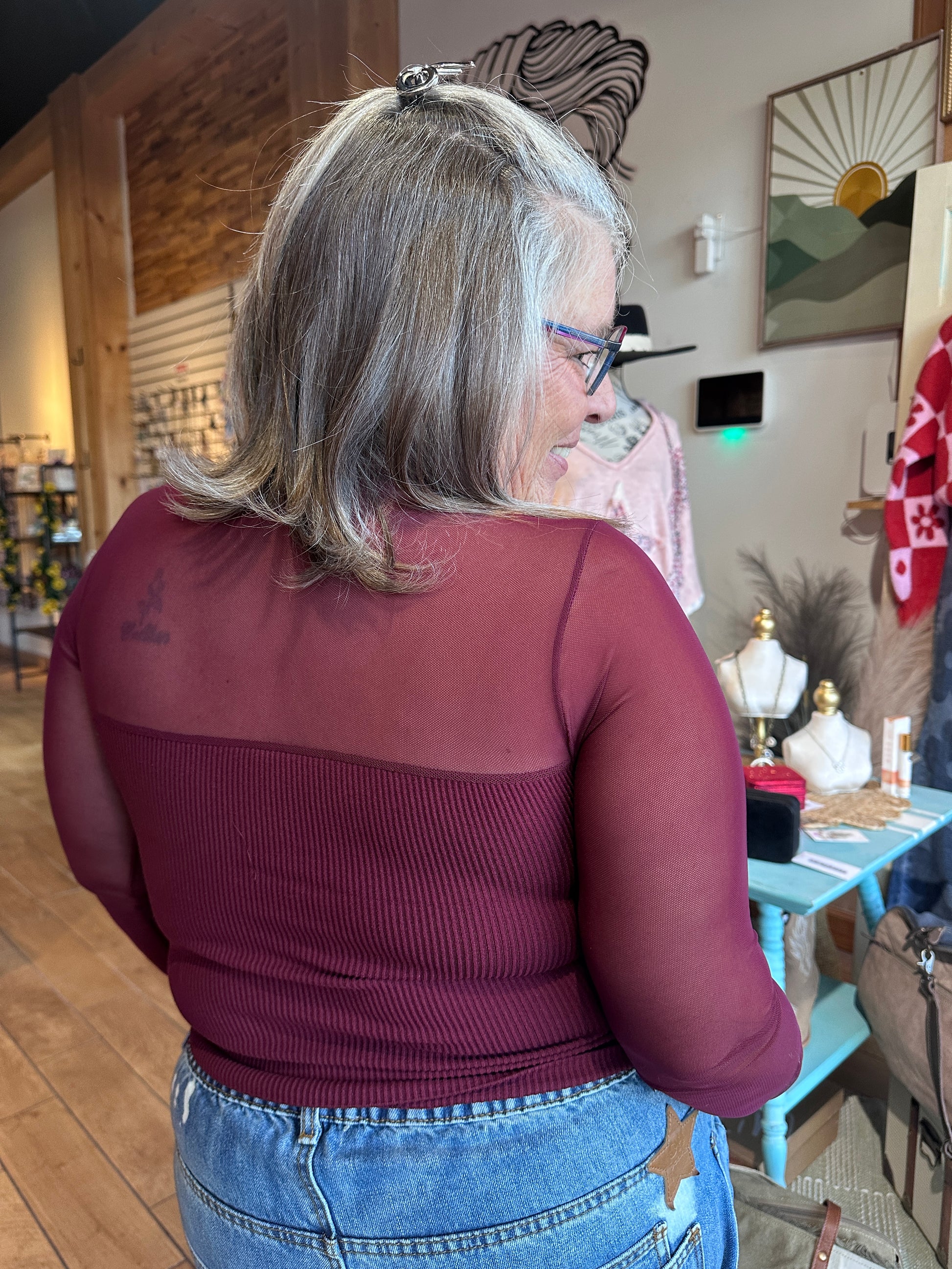 Cropped and perfect to add to your layered look! Stretchy mesh sleeves allow for seamless coverage. We love throwing it on under sleeveless sundresses like the Tuck It Up Dress and Tuck Dress in Rust.